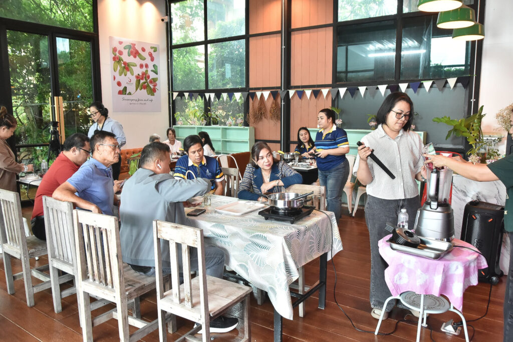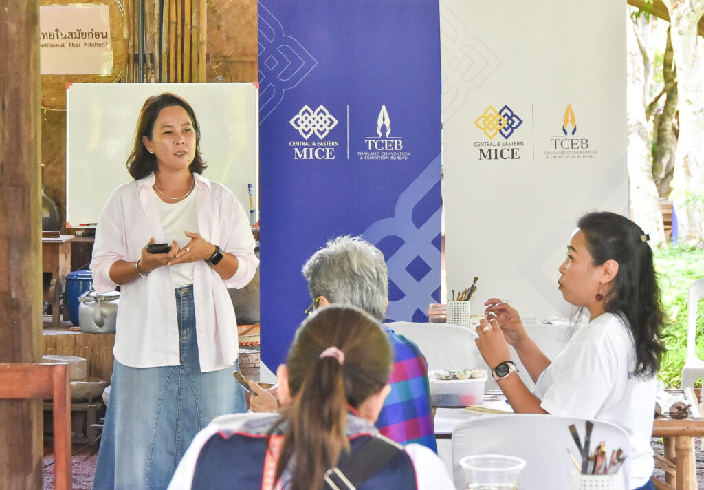 ในช่วงบ่าย คณะฯ ได้เดินทางไปยัง สวนมะนาวโห่ลุงศิริ แหล่งท่องเที่ยวเชิงเกษตรอินทรีย์ เพื่อเรียนรู้การแปรรูปผลผลิตทางการเกษตร และร่วมกิจกรรม “Jamming Retreat: ทำแยมมะม่วงหาว มะนาวโห่” ซึ่งสะท้อนถึงแนวคิด From Farm to Table ที่สามารถนำมาปรับใช้กับกิจกรรมไมซ์ได้เป็นอย่างดี จากนั้นจึงเดินทางต่อไปยัง วิสาหกิจชุมชนเกษตรสวนนอก เพื่อสัมผัสกับกิจกรรมที่เน้นการสร้างมูลค่าเพิ่มจากวัสดุในท้องถิ่น (Upcycling) อาทิ “Dyeing Retreat: มัดย้อมสีธรรมชาติจากใบลิ้นจี่” และ “Coco Retreat: สครับบำบัดผิว จากกากมะพร้าว” ซึ่งแสดงให้เห็นถึงความคิดสร้างสรรค์และศักยภาพของชุมชนในการรองรับนักเดินทางกลุ่มไมซ์กับกิจกรรมแนวคิดที่เป็นมิตรต่อสิ่งแวดล้อม