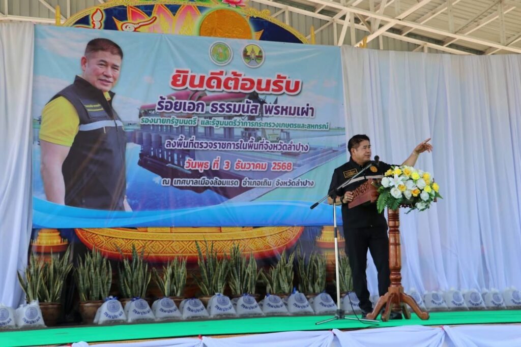 วันที่ 3 ธันวาคม 2568 ร.อ.ธรรมนัส พรหมเผ่า รองนายกรัฐมนตรี และรัฐมนตรีว่าการกระทรวงเกษตรและสหกรณ์ ลงพื้นที่ตรวจราชการจังหวัดลำปาง เพื่อติดตามความก้าวหน้าโครงการพัฒนาแหล่งน้ำสำคัญของจังหวัด โดยเฉพาะ “โครงการประตูระบายน้ำแม่น้ำวังบ้านเหล่า” ในตำบลล้อมแรด อำเภอเถิน รวมถึงการขุดลอกลำน้ำวัง การป้องกันตลิ่งพัง และการบริหารจัดการน้ำทั้งระบบในอำเภอแม่พริกและพื้นที่ใกล้เคียง โดยมีผู้บริหารกระทรวงเกษตรและสหกรณ์ กรมชลประทาน หน่วยงานท้องถิ่น และตัวแทนเกษตรกรร่วมให้ข้อมูลอย่างพร้อมเพรียง