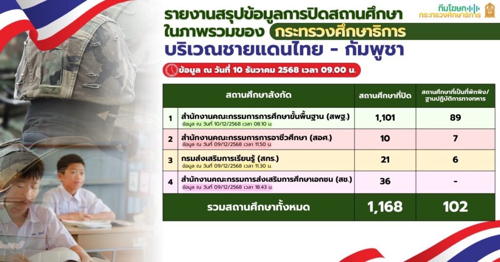 เมื่อวันที่ 10 ธันวาคม เวลา 10.40 น. ศ.ดร.นฤมล ภิญโญสินวัฒน์ รัฐมนตรีว่าการกระทรวงศึกษาธิการ เปิดเผยถึงสถานการณ์ของสถานศึกษาในพื้นที่ชายแดนไทย–กัมพูชา ว่า เนื่องจากสถานการณ์การสู้รบยังคงดำเนินอย่างต่อเนื่อง และมีแนวโน้มขยายวงกว้างในหลายพื้นที่ ส่งผลให้กระทรวงศึกษาธิการต้องสั่งปิดสถานศึกษาเพิ่มเป็น 1,168 แห่ง เพื่อความปลอดภัยของนักเรียน ครู และบุคลากรทางการศึกษา ขณะเดียวกัน โรงเรียนในพื้นที่ปลอดภัย จำนวน 102 แห่ง ได้ถูกจัดตั้งเป็นศูนย์พักพิงชั่วคราวรองรับประชาชนที่ต้องอพยพออกจากพื้นที่เสี่ยง